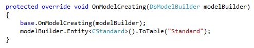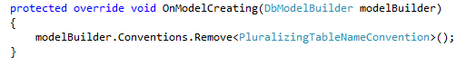 This would ensure that the Standard Table is created with a plural name. Overriding OnModelCreating is very useful method to have when you need to provide customization of tables that is being generated by Entity Framework.
