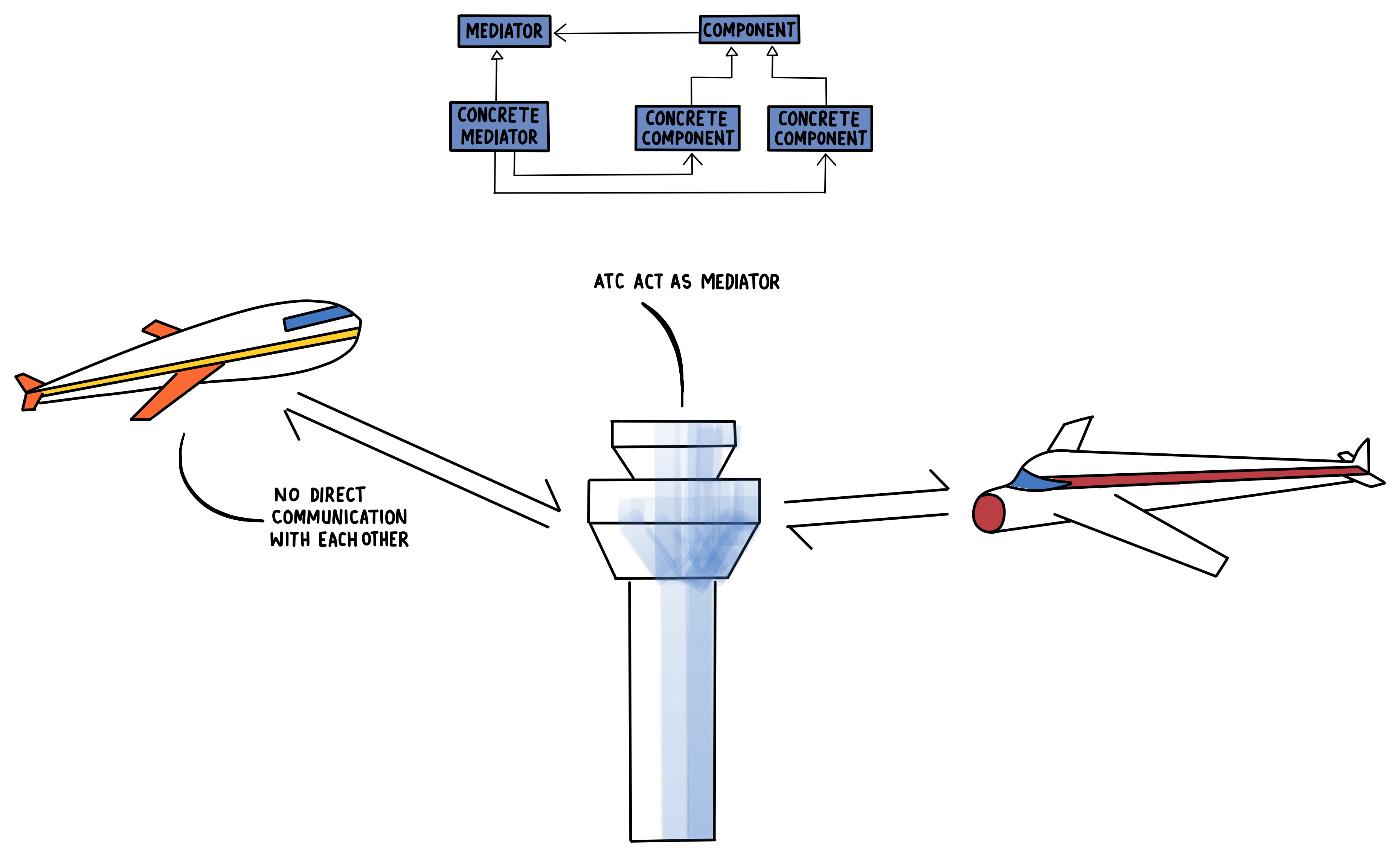I have intensionally named the methods differently because of the Mediator Pattern doesn’t quite say we need to have the same signature for the communicating method/methods. In fact, the only thing it needs to do is to communicate via the mediator instance.