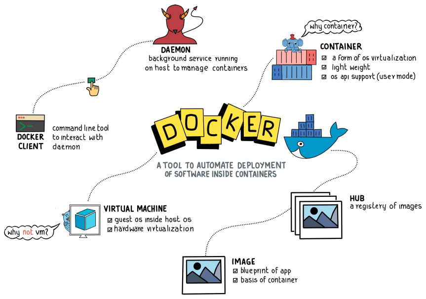 Hold on – doesn’t that sound similar to _Virtual Machines_? Both containers and virtual machines are resource virtualization technologies and they do sound similar in many ways, but there are some essential differences. The Virtual Machines, or VMs, virtualize the hardware layers, emulating a physical computer. The hypervisor, the software(or firmware) component that virtualizes the hardware and creates/runs virtual machines, allows the host machine to support multiple VMs by virtually sharing the resources such as memory and processing power. They are heavy packages that run insolation as fully standalone operating systems and hence consume a lot of resources for simpler scenarios.