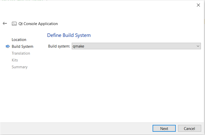 Select Build System. For this example, we have chosen qMake.
