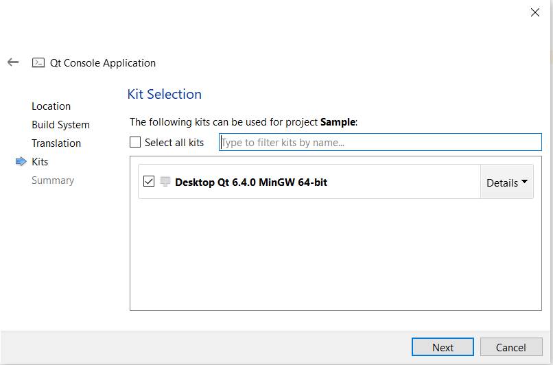 The Kit selection allows you to choose the platforms you would be targeting the application. For our hello world, we will choose only Desktop.