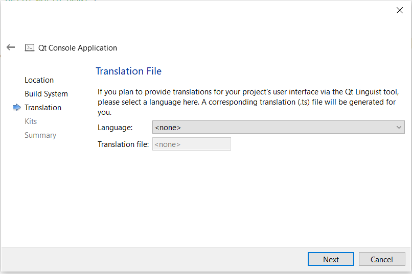 If you are aiming a multi-lingual application, select the translation file. For this example, we will choose to skip the translation file.